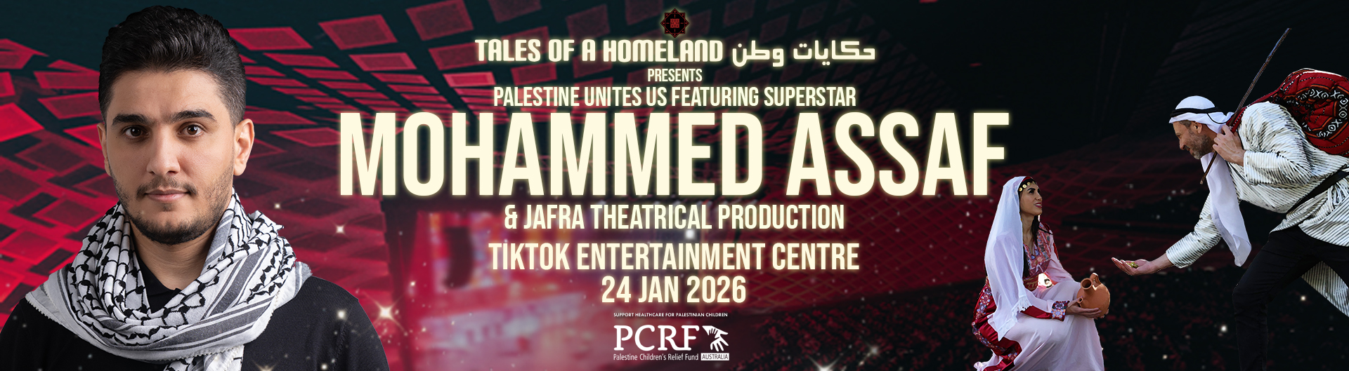 Experience a live concert by international superstar Mohammad Assaf, whose voice has carried the dreams and hopes of a nation. The event also features the debut stage production Jafra—a moving theatrical journey of love, defiance, and the unbreakable Palestinian spirit.